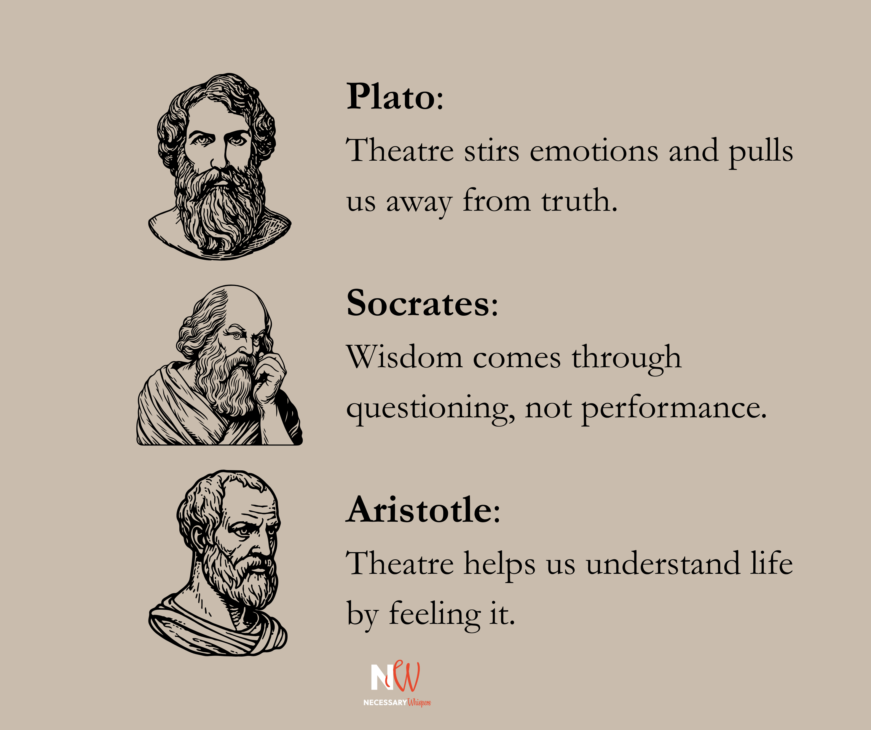 This essay explores the philosophical tensions surrounding theatre in the writings of Plato, Socrates (as portrayed by Plato), and Aristotle. In their competing visions—suspicion, interrogation, and celebration—we encounter a triptych of enduring questions about the role of art in civic and moral life. Their disagreements are not confined to the past. They still echo in conversations about education, politics, and the power of performance.
