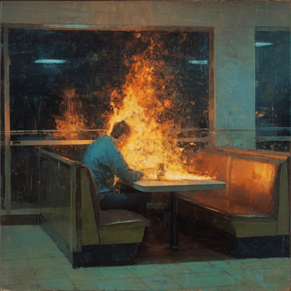 It gathered itself first, narrow and deliberate, like a man straightening his tie before stepping into a room. The flame rose from the center of him in a single, disciplined line, bright without frenzy. It kept its posture. It traced the length of his body with precision, as though even humiliation preferred form. The vinyl held. The napkin lay flat. The sugar caddy caught the light and gave nothing away. The fire belonged to him and to no other surface.